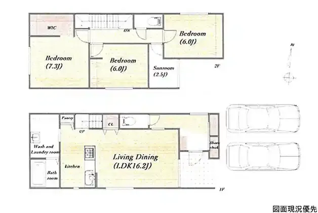 | 設備 | トイレ2ヶ所、システムキッチン、カウンターキッチン、食器洗浄乾燥機、ウォークインクローゼット、洗髪洗面化粧台、モニタ付インターホン、駐車場2台分、SIC、サンルーム(2.5帖)、パントリー、リビング階段 | ||