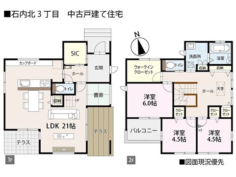 | 設備 | 温水洗浄便座、トイレ2ヶ所、追焚機能、浴室乾燥機、カウンターキッチン、IHクッキングヒーター、食器洗浄乾燥機、ウォークインクローゼット、床下収納、洗髪洗面化粧台、電気、上水道、下水道、複層ガラス、モニタ付インターホン、庭、駐車場2台分、書斎、シューズインクローゼット、テラスデッキ、室内物干し | ||